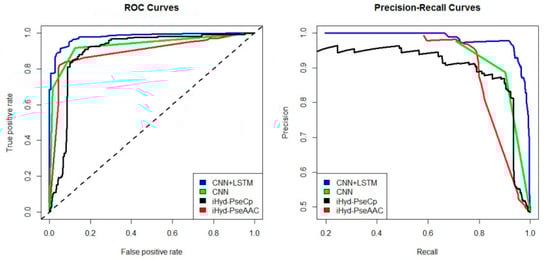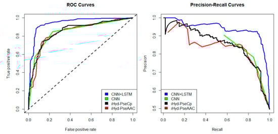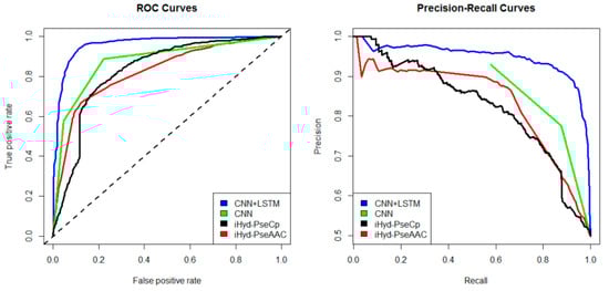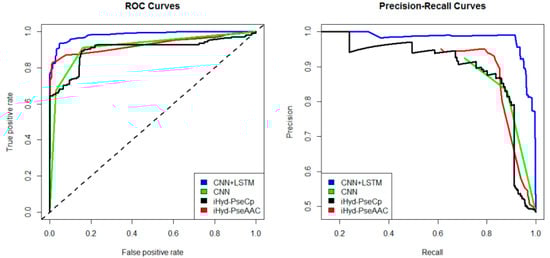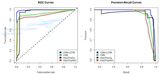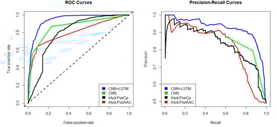 iHyd-PseAAC = 0.81. CNN+LSTM achieved remarkably greater AUCs than other methods in all datasets, further demonstrating the excellent performance of our model.
