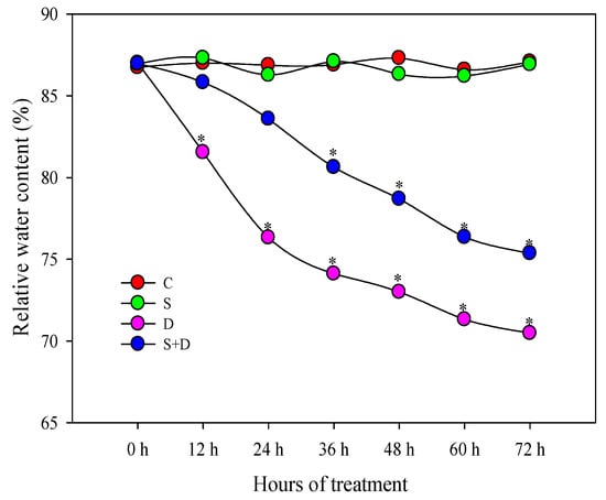 Change of relative water content (RWC) in leaves of wheat seedlings under normal water conditions and in response to three different treatments at different time points; a total of three independent biological replicates were conducted (n = 10). C, normal water conditions; S, pretreated with 150 µmol/L sodium nitroprusside; D, water deficiency induced by 20% polyethylene glycol (PEG)-6000; S + D, pretreated with 150 µmol/L sodium nitroprusside and water deficiency stress by 20% PEG-6000. Asterisks indicate significant differences among the four treatments at p < 0.05.
