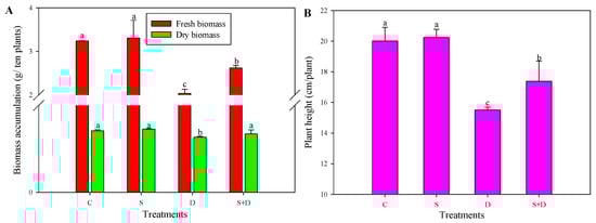 Leaf relative water content (RWC) showed a gradual decline both in “D” and “S + D” treatments; however, “S + D” exhibited higher RWC than “D” plants (Figure 1) during 72 h of D stress. Biomass results showed that D without SNP treatment inhibited the growth of wheat, while the growth state in the “S + D” treatment exceeded that of the “D” treatment. Here, this was also reflected in fresh and dry biomass accumulation as well as in plant height; S + D increased by 28.8%, 6.0%, and 12.2%, respectively, compared to D treatment (Figure 2A,B).