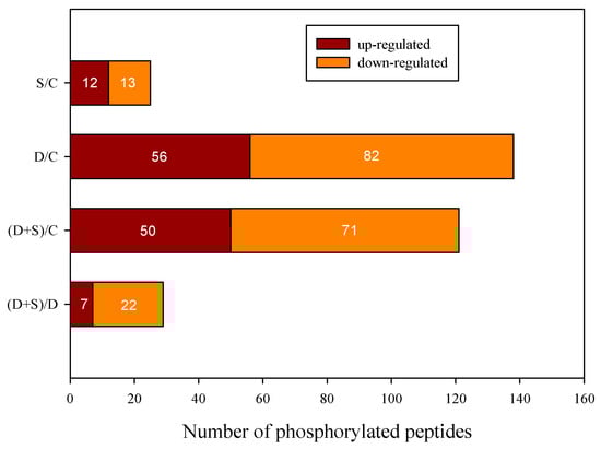 A number of studies indicated that phosphorylation played an important role in drought and chilling tolerance [,]. Here, 148 significant DEPs were identified in response to D or NO treatments. D was the single largest contributor to the variation among all four phosphoproteomic datasets obtained via PCA, followed by NO. This indicates that D treatment potentially impacts the phosphorylation of these proteins more significantly than NO treatment.