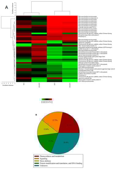 (A) Cluster analysis and (B) functional classification of significant differentially phosphorylated peptides in leaves of winter wheat among four different treatments. The color scale bar at the left of the hierarchical cluster analysis indicates the increased (red) and the decreased (green) peptides. For a detailed description of treatment conditions, please refer to the legend of Figure 1.