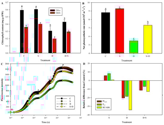 (A) Chlorophyll (Chl) content (Chl a, Chl b), (B) net photosynthetic rate (Pn), (C) fluorescence intensity, PIABS, PET, and (D) RC/ABS in leaves of wheat seedlings under normal water conditions and in response to NO or PEG-induced water deficiency treatments. C, normal water conditions; S, pretreated with 150 µmol/L sodium nitroprusside; D, water deficiency induced by treatment with 20% polyethylene glycol (PEG)-6000; S + D, pretreated with 150 µmol/L sodium nitroprusside and then water deficiency stressed by 20% PEG-6000. O, J, I and P mean that the analysis of the transient-considered fluorescence values at 50 ms (Fo, step O), 2 ms (F2 ms, step J), 30 ms (F30 ms, step I), and maximal level (FM, step P), respectively. For a detailed description of treatment conditions, please refer to the legend of Figure 1. Different lowercase letters in (A,B) indicate a statistically significant difference at p < 0.05.