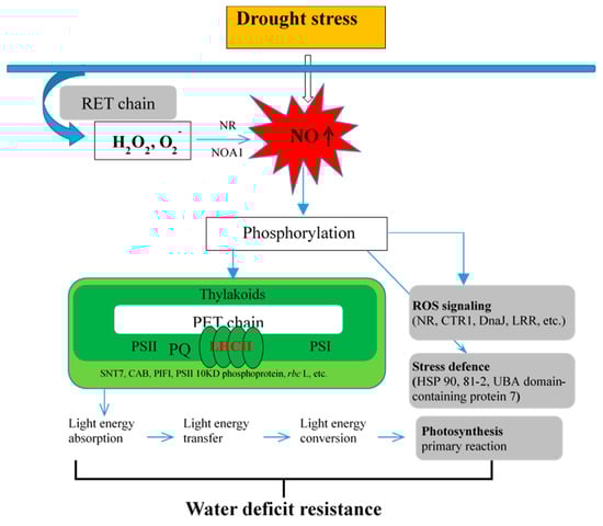 In this study, in response to D stress, the ROS that was generated via oxidative burst (intersystem electron transport (PET) from chloroplast and respiratory chain (RET) of mitochondria) is suggested to trigger NO synthesis. Under D stress, NO activates the phosphorylation of photosynthesis, signaling, and stress defense-related peptides, thus promoting stress tolerance. Additionally, when seedlings suffered from D stimuli, PSII momentarily ran faster than PSI; thus, this led to the uneven excitation of both the PS-generated redox and ROS signals that are then transmitted as retrograde signals to the cytosol, mitochondrion, and nucleus. During PET, including the PQ pool, the LHCII kinase SNT7 activates the phosphorylated LHCII. For example, the CAB protein moved from PSII to PSI, compensates the imbalance, and upregulates the PIFI phosphorylation level. This improved absorption, transfer, and conversion of light energy. These changes therefore enhance the primary reaction of photosynthesis, which carries implications for the mechanisms with which NO improves WD resistance.