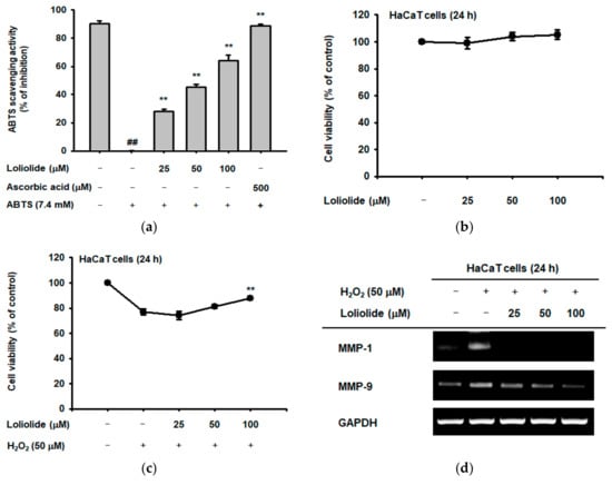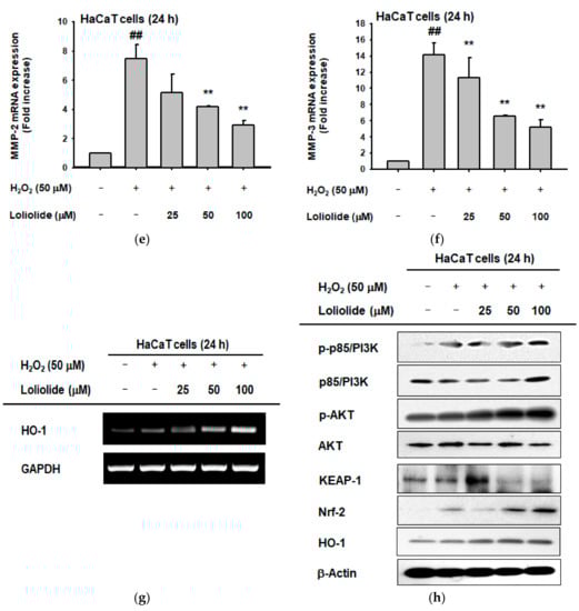 We evaluated the antioxidant effects of loliolide using a 2,2′-azino-bis (3-ethylbenzothiazoline-6-sulphonic acid) (ABTS) assay, which can be useful to measure the level of hydroxyl radicals, with ascorbic acid as a positive control compound, since we have chosen H2O2 as an oxidative stress inducer []. Loliolide reduced the ABTS radical with an IC50 value of 61.52 ± 2.12 μM in the ABTS assay (Figure 2a) []. We determined the viability of HaCaT cells in the presence of loliolide using an MTT assay and found that cell viability was unaffected, even up to a concentration of 100 μM (Figure 2b). We also assessed the viability of HaCaT cells treated with loliolide and H2O2. Loliolide protected HaCaT cells against cell death caused by H2O2-induced oxidative stress in a dose-dependent manner (Figure 2c). Next, we examined the expression of genes encoding MMPs in HaCaT cells. MMPs are involved in senescence and cell death resulting from increased oxidative stress caused by ROS []. The expression of MMPs in HaCaT cells after treatment with H2O2 and loliolide was determined by RT-PCR and real-time PCR analyses. H2O2 treatment upregulated the expression of MMPs, but loliolide reduced the increase in MMP gene expression in a dose-dependent manner (Figure 2d–f). To confirm the antioxidative mechanism of loliolide, we treated HaCaT cells with H2O2 to induce oxidative stress. When the H2O2-treated cells were simultaneously treated with loliolide, the expression of HO-1, an important antioxidant gene [], was increased in a dose-dependent manner (Figure 2g). We also examined the expression of proteins in the NRF2-KEAP1 signaling pathway in relationship to HO-1 gene regulation. The expression levels of the PI3K, AKT, and NRF2 proteins in the NRF2-KEAP1 signaling pathway, and HO-1 were increased in HaCaT cells treated with H2O2 and/or loliolide (Figure 2h) [].