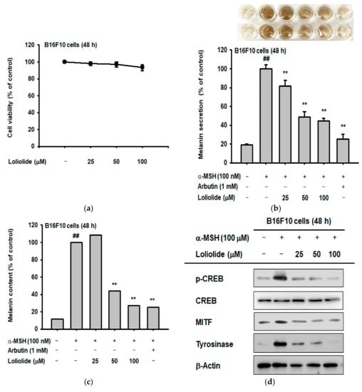 Anti-melanogenic effect of loliolide. (a) Measurement of cell viability by MTT assay in loliolide-treated B16F10 cells. (b) Measurement of melanin secretion by melanin secretion assay in B16F10 cells treated with α-MSH and loliolide. (c) Measurement of melanin production by melanin content assay in B16F10 cells after treatment with α-MSH and loliolide. (d) Western blot analysis of the expression of MC1R signaling pathway proteins in α-MSH- and/or loliolide-treated B16F10 cells. Statistical significance (b,c) was evaluated using the Kruskal–Wallis/Mann–Whitney test. ## p < 0.05 compared with normal group and ** p < 0.01 compared with control.