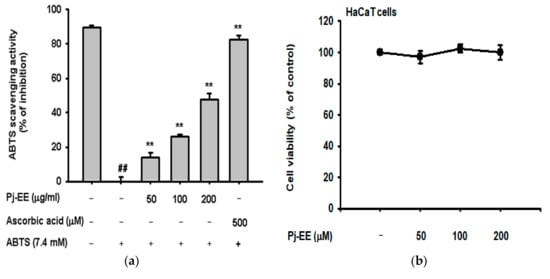ABTS (7.4 mM) and potassium sulfate (2.4 mM) solutions were mixed at a ratio of 1:1 and incubated overnight at room temperature to produce ABTS radical cation. Loliolide (0–100 μM), Pj-EE (0–200 μg/mL), or ascorbic acid (500 mM) were added to a 96-well plate, and ABTS solution was added at a ratio of 1:1. The mixture was incubated at 37 °C for 30 min. Absorbance at 730 nm was measured. The ABTS scavenging activity is expressed as a percentage []: