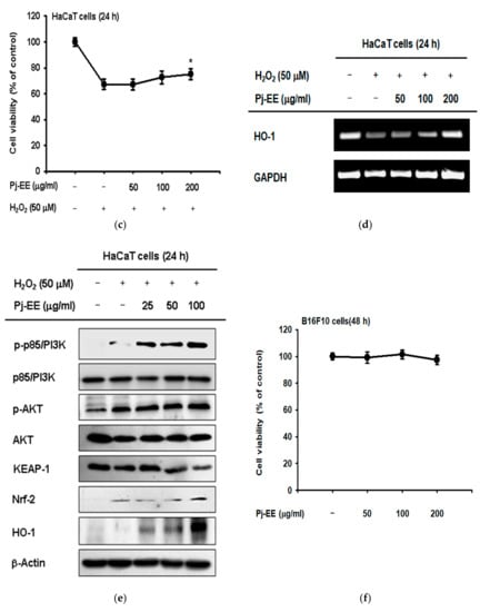 We examined the antioxidant effect of Pj-EE, known to have loliolide as major active principle [], in this extract, using the ABTS assay with ascorbic acid as a positive control compound. Pj-EE reduced ABTS radicals with an IC50 value of 241.17 ± 9.32 μg/mL in the ABTS assay (Figure 4a). Cell viability was measured by MTT assay to examine the cytotoxicity of Pj-EE to B16F10 cells. Pj-EE did not show cytotoxicity to B16F10 cells up to a concentration of 200 μg/mL (Figure 4b). The viability of HaCaT cells treated with H2O2 and Pj-EE was determined by MTT assay. Pj-EE slightly inhibited the cell death caused by H2O2 (Figure 4c). To determine the effect of Pj-EE on the expression of HO-1 in HaCaT cells, we performed RT-PCR analysis of HaCaT cells after treatment with Pj-EE, and H2O2. HO-1 expression was significantly suppressed by H2O2, but the suppression was alleviated by Pj-EE treatment in a dose-dependent manner (Figure 4d). To measure the expression of the HO-1 protein [], HaCaT cells were treated with H2O2 and Pj-EE together, followed by Western blot analysis. Because HO-1 is activated by the NRF2-KEAP1 signaling pathway [], we investigated the expression of proteins in the NRF2-KEAP1 signaling pathway. Pj-EE treatment increased the expression of the PI3K, AKT, and NRF2 proteins and HO-1 (Figure 4e) []. These results showed that the oxidative stress-protective effect of Pj-EE was very similar to that of loliolide.