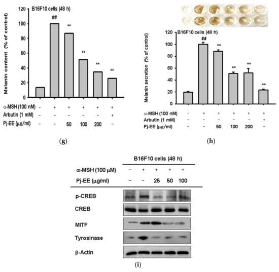 Next, we used B16F10 cells to identify Pj-EE anti-melanogenic effects. MTT assays were performed to assess Pj-EE cytotoxicity to B16F10 cells. Like loliolide, Pj-EE showed no cytotoxicity to B16F10 cells up to a concentration of 200 μg/mL (Figure 4f). To investigate the anti-melanogenic effect of Pj-EE, B16F10 cells were treated with the melanogenesis inducer α-MSH and Pj-EE and analyzed for melanin content and secretion. Arbutin was used as a positive control compound. Pj-EE effectively suppressed melanin production and secretion, both of which were increased by α-MSH (Figure 4g,h). Additionally, we investigated the molecular mechanism of the anti-melanogenic effect of Pj-EE on B16F10 cells. The important signaling pathway for melanin formation in B16F10 cells is the MC1R signaling pathway, and the MC1R signaling pathway is activated by the melanin inducer α-MSH. Thus, we analyzed the expression of proteins in the MC1R signaling pathway by Western blot. The levels of p-CREB, MITF, and tyrosinase proteins in the MC1R signaling pathway were markedly reduced in a dose-dependent manner by treatment with Pj-EE (Figure 4i) [].