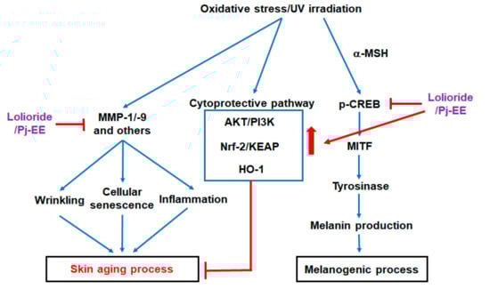 Our skin is often exposed to oxidative stress and UV light. These stimuli can disrupt the homeostasis of the skin and can cause diseases, such as the skin cancer, pigmentation, and psoriasis [], as also summarized in Figure 5. For this reason, maintaining homeostasis is important for preserving skin health. Antioxidants, in particular, are essential for homeostasis []. Therefore, antioxidants that reduce oxidative stress are needed to protect the skin from external stimuli and maintain healthy skin []. We demonstrated that loliolide and Pj-EE could be useful as skin antioxidants, via enhancement of HO-1 through the activation of AKT/PI3K pathway as indicated in Figure 5, as well as agents potentially protecting against skin cancer. Since there was no skin irritation under loliolide treatment conditions in our preliminary clinical study with three people (data not shown), additional research will be followed to prove these effects of loliolide and Pj-EE on human skin or artificial human skin as well as clinical study.