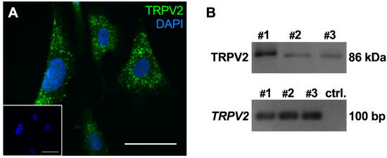 TRPV2 expression was confirmed in cultured HTPCs. (A) On the cellular level, TRPV2 exhibited a scattered expression pattern. Scale bar 10 µm. (B) In cultured HTPCs, expression of TRPV2 was detected by Western blot with a single band of the expected size (86 kDa) and RT-PCR showed clear bands at ~100 bp. Sequencing of the PCR-product validated expression of TRPV2. Bands obtained from three individual patients (#1–3) and negative control without cDNA in the RT-PCR reaction (ctrl.).