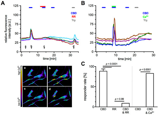 Expression of TRPV2 is reported in dendritic cells, granulocytes, lymphocytes, monocytes, and macrophages [24,31], i.e., cells where the concentration of intracellular Ca2+ is crucial for their proper functionality. In HTPCs, we did not observe obvious changes in cell size or any other hints of contractions associated with increases of intracellular Ca2+ levels. Such changes in HTPCs were previously seen, for example, upon addition of angiotensin II [10]. Hence CBD-induced activation of TRPV2 may not be linked to the regulation of contractility of HTPCs. This point remains to be further investigated as it was suggested to occur in retinal arterioles [14].