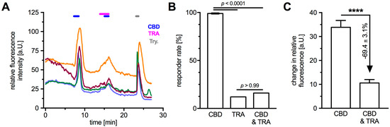 Application of the TRPV2-blocker TRA provided further evidence for functionality of TRPV2 in HTPCs during Ca2+ imaging. (A) In presence of CB1 and CB2 blockers (AM251 and AM630), application of TRPV2 activator CBD (10 µM) led to a transient increase in intracellular Ca2+ that could partially be blocked by TRA (10 µM). Graph shows original traces of four representative cells; three individual donors were analyzed. In all experiments, trypsine (1‰) served as positive control. (B) The total rate of responding cells upon CBD application was 99.0 ± 0.6% (25 cells from 3 donors). TRA application elicited transients in 12% of the analyzed cells and combination with CBD led to a responder rate of 16% (25 cells from 3 donors). The data were analyzed using Fisher’s exact test. (C) Application of TRA significantly reduced the measured changes in fluorescence intensity compared to the initial CBD-induced Ca2+ transients (**** p < 0.0001; 25 cells from 3 donors).