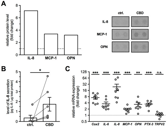 In addition, several other factors were found to be slightly elevated in the culture medium (>2-fold change: Insulin-like growth factor-binding protein-3, Interleukin-17A, Urokinase receptor). As IL-8 secretion showed the strongest increase upon CBD treatment, HTPCs from 6 more patients were investigated using an immunoassay. CBD treatment (24 h, 10 µM) resulted in significantly increased IL-8 levels in the culture media (Figure 5B), with 0.35 ± 0.28 pg/µg in supernatants from untreated and 1.74 ± 0.69 pg/µg in those from treated cells (Wilcoxon test, p = 0.0312; n = 6). Also, at the mRNA level, expression of IL-8 (23.91 ± 7.88-fold, p < 0.0001), MCP-1 (1.94 ± 0.21-fold, p = 0.0008) and OPN (3.38 ± 0.70-fold, p = 0.0012) were significantly increased in CBD treated cells (n = 8). Additionally, the mRNA levels of Cox2 (8.34 ± 1.78-fold, p < 0.0001), IL-6 (3.62 ± 0.78-fold, p = 0.0005) and PTX-3 (3.24 ± 0.42-fold, p = 0.0002) showed significant increases. However, TRPV2 itself did not show any changes (1.08 ± 0.09-fold, p = 0.5905) in expression level upon 24 h activation (Figure 5C; n = 8).