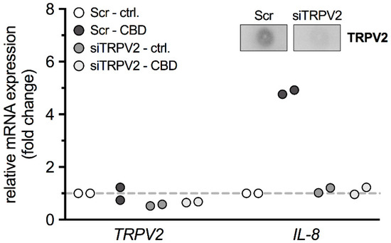 Transfection of HTPCs with a TRPV2 siRNA abolished the observed effects upon IL-8. Quantitative PCR data from HTPCs transfected with scrambled (Scr) non-targeting control siRNA or TRPV2 siRNA (siTRPV2) and treated with CBD (10 µM; Scr-CBD and siTRPV2-CBD) or equal volume of EtOH (Scr-ctrl. and siTRPV2-ctrl.) for 24 h. Upper panel shows a representative TRPV2 dot blot from HTPCs transfected with scrambled (Scr) non-targeting control siRNA and TRPV2 siRNA (siTRPV2), emphasizing the efficiency of the transfection.