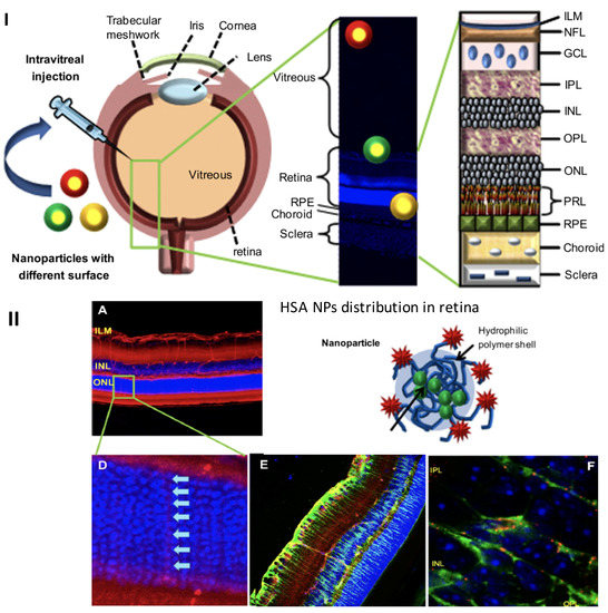 - Kim, H.; Robinson, S.B.; Csaky, K.G. Investigating the movement of intravitreal human serum albumin nanoparticles in the vitreous and retina. Pharm. Res. 2009, 26, 329–337. [Google Scholar] [CrossRef] [PubMed]