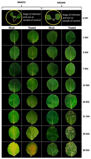 Ringspot disease progress in R line BN4072 and S line BN3449 of cabbage. Plants were infected at the three-leaf stage (yellow circles). Infected leaves were examined from 1–30 DAI (days after inoculation). HPI (Hours post inoculation), R: Resistant; S: Susceptible.
