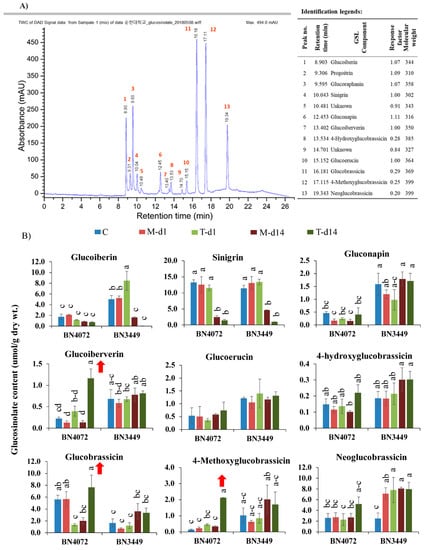 (A) A sample illustrative spectrum obtained from mass spectrometry analysis (HPLC/MS, Agilent 1200 series, Agilent Technologies) to identify individual GSLs of cabbage leaf extracts. Tentative determination of peaks, Retention time (min), Response factors were performed as indicated in the identification legends. (B) Individual glucosinolate contents of leaf samples from ringspot R line BN4072 and S line BN3449 of cabbage under different treatments (C: Control; M-d1: Mock day 1; T-d1: Treated day 1; M-d14: Mock day 14; T-d14: Treated day 14). The means of three biological replicates are shown. Vertical bars indicate standard deviation. Different letters indicate statistically significant differences between R and S lines, and treatment interactions. Upward-pointing red arrows indicate increased glucosinolate content in response to Mycosphaerella brassicicola infection. R: Resistant; S: Susceptible.