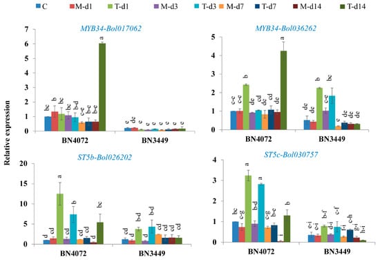 Remarkable upregulation of MYB34-Bol017062, MYB34-Bol036262, ST5b-Bol026202, and ST5c-Bol030757 genes in Ringspot R line BN4072 at 14 DAI compared to mock-treated plants. C: Control; M-d1: Mock day 1; T-d1: Treated day 1; M-d3: Mock day 3; T-d3: Treated day 3; M-d7: Mock day 7; T-d7: Treated day 7; M-d14: Mock day 14; T-d14: Treated day 14. The means of three biological replicates are shown. Vertical bars indicate standard deviation. Different letters indicate statistically significant differences between R line BN4072 and S line BN3449, and treatment interactions. R: Resistant; S: Susceptible.