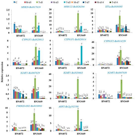 Upregulated genes of transcription factor related and glucosinolate biosynthesis genes in Ringspot S line BN3449 of cabbage. C: Control; M-d1: Mock day 1; T-d1: Treated day 1; M-d3: Mock day 3; T-d3: Treated day 3; M-d7: Mock day 7; T-d7: Treated day 7; M-d14: Mock day 14; T-d14: Treated day14. The means of three biological replicates are shown. Vertical bars indicate standard deviation. Different letters indicate statistically significant differences between R and S lines, and treatment interactions. R: Resistant; S: Susceptible.