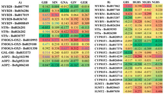 A heat map emphasized that the fold changes in the expression levels of transcription factor-related genes and GSL biosynthesis genes observed after pathogen inoculation were consistent with the changes in the levels of individual GSLs measured in the R and S lines, compared to their mock-treated samples. Pearson’s correlation coefficients showed the highest significant positive correlation with the aliphatic GSLs GIB, SIN, and GER with FMOGS-OX2-Bol010993 expression; whereas a positive correlation was also observed for SIN with MYB28-Bol017019 expression; GNA with FMOGS-OX5-Bol031350 expression; and GIV with ST5b-Bol026202 expression (Figure 5A). In the case of indolic GSLs, GBS, and MGBS had the highest significant positive correlation with MYB34-Bol017062 expression but NGBS had the highest significant positive correlation with CYP81F2-Bol014239 expression (Figure 5B).