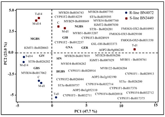 Biplot of cabbage ringspot R and S lines, glucosinolate components, and responses of glucosinolate pathway genes (denoted within figure) as determined by principle component analysis (PCA). Red squares denote the mean PC scores of the R line BN4072, and blue circles denote the mean PC scores of S line BN3449. Mycosphaerella brassicicola treatments indicated by C: Control; M-d1: Mock day 1; T-d1: Treated day 1; M-d14: Mock day 14; T-d14: Treated day14. Glucosinolate (GSL) components are GIB: glucoiberin; SIN: sinigrin; GNA: gluconapin, GIV: glucoiberverin; GER: glucoerucin; GBS: glucobrassicin; NGBS: neoglucobrassicin; MGBS: methoxyglucobrassicin; and HGBS: hydroxyglucobrassicin. R: Resistant; S: Susceptible.