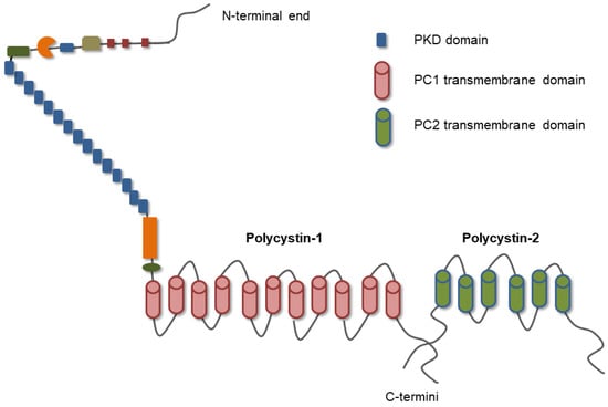 Molecular structure of polycystins. Polycystin-1 has a long N-terminal end with 16 copies of the polycystic kidney disease (PKD) domain and additional domains for cell-to-cell and cell-to-matrix interactions. It has eleven transmembrane domains and a C-terminus that interacts with the Polycystin-2 C-terminus, therefore functioning as a protein complex. Polycystin-2 has six transmembrane domains and both ends are intracellular or in the interior of cell organelles, such as the endoplasmic reticulum. PC1, polycystin-1; PC2, polycystin-2 (Reprinted from Reference [8], © 2015, with permission from Elsevier).