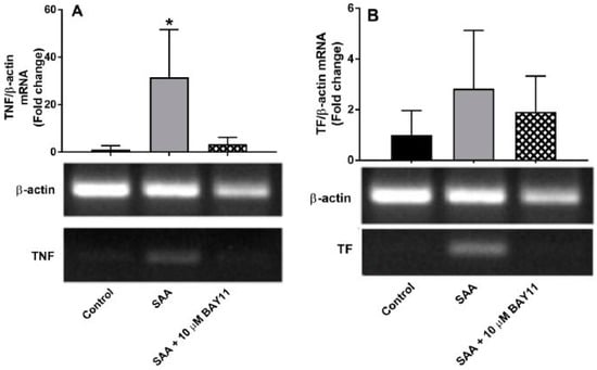 Relative gene expression in HCtAEC in response to SAA in the absence and presence BAY11-7082 under normoglycaemic conditions. HCtAEC were incubated with 10 μg/mL SAA or vehicle (control) with or without 10 μM BAY11-7082 pre-treatment under normoglycaemic conditions (5 mM glucose). Total RNA was isolated after 4.5 h and gene regulation was assessed. Representative gels and semi-quantitative analysis are shown for (A) TNF (B) TF. Gene expression was normalised against β-actin and results represent fold change compared to control cells. Data shows the mean ± SD (n = 3 individual experiments each completed in duplicate; therefore, data represent 3 technical replicates); * p < 0.05 compared to control, where possible, target gene products were confirmed by sequence analysis (refer to supplementary data Figures S1–S3).