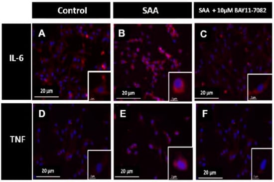 Next, immunocytochemistry experiments were performed to assess the level and distribution of IL-6 and TNF (Figure 4) in order to determine whether gene regulation resulted in corresponding transcriptional regulation of the inflammatory cytokines. HCtAEC treated with 10 μg/mL SAA displayed more IL-6 positive (red) staining in the cell cytoplasm than the control group in the absence of SAA stimulation, (compare Figure 4A,B). IL-6 immuno-positive staining markedly diminished in cells pre-treated with 10 μM BAY11-7082 prior to SAA insult (compare Figure 4B,C and corresponding insets highlighting IL-6+ immune-fluorescence within single cells). As predicted based on SAA-mediated increases in TNF mRNA (see Figure 2), immuno-positive TNF increased in the cytoplasm of HCtAEC following incubation with 10 μg/mL of SAA (compare Figure 4D,E) while a decreased cytoplasmic accumulation of TNF was noted in cells pre-incubated with BAY11-7082 (Figure 4F). These results confirm that BAY11-7082-mediated inhibition of NFκB concomitantly decreases secretory IL-6 protein (consistent with data shown in Figure 3) while also demonstrating that TNF protein expression was also sensitive to inhibition of NFκB in HCtAEC in the presence of SAA.