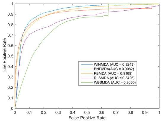 We evaluated the performance of WINMDA by observing it along with four state-of-the-art methods to predict the accuracy of potential miRNA–disease associations using global and local LOOCV. In the global LOOCV, each known disease–miRNA association was alternately used as a test sample, and other known miRNA–disease associations were considered as a training set, while all unknown disease–miRNA associations in HMDD were considered as a candidate set. However, in local LOOCV, for each given disease d, each known miRNA related to d was utilized as a test sample, while all other known miRNAs related to d were used as training samples, and all other unknown miRNAs related to d were considered as candidates. Hence, through comparing the scores obtained from the test sample with other candidate associations, we could evaluate how well this association was ranked in the candidate set; if the predicted ranking of the test sample was higher than the preset threshold, then the sample was successfully predicted by the computational model. In other words, let TP be true positive, TN be true negative, FN be false negative, and FP be false positive; then, under different threshold settings, the corresponding true positive rate (TPR; sensitivity) and false positive rate (FPR; specificity) can be obtained as follows:
