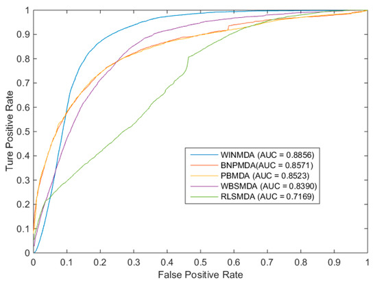 Figure 1. The comparison results between the weighted interactive network for miRNA–disease association inference (WINMDA) and four state-of-the-art computational models in terms of global leave-one-out cross-validation (LOOCV).