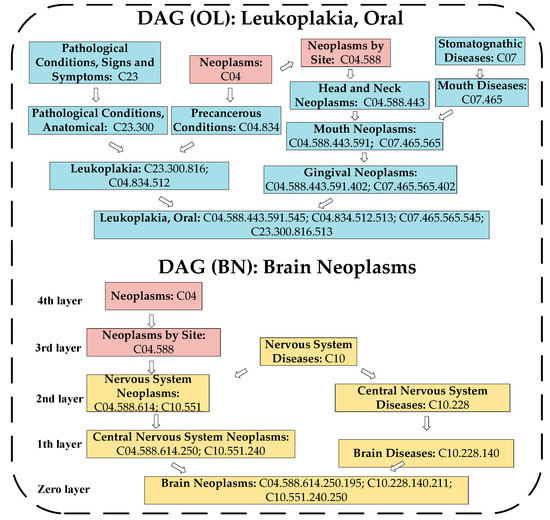 For example, according to Equation (3), in DAG(BN) of Figure 3, the semantic value of the disease “brain neoplasms” can be obtained by “the contributions of ‘brain neoplasms’ to it” (= 1 × 1) + “the contributions of ‘central nervous system neoplasms’ to it” (= 2 × 0.5) + “the contributions of ‘brain diseases’ to it” (= 1 × 0.5) + “the contributions of ‘nervous system neoplasms’ to it” (= 2 × 0.5 × 0.5) + “the contributions of ‘central nervous system diseases’ to it” (= 1 × 0.5 × 0.5) + “the contributions of ‘nervous system diseases’ to it” (= 1 × 0.5 × 0.5 × 0.5 + 1 × 0.5 × 0.5 × 0.5) + “the contributions of ‘neoplasms by site’ to it” (= 1 × 0.5 × 0.5 × 0.5) + “the contributions of ‘neoplasms’ to it” (= 1 × 0.5 × 0.5 × 0.5 × 0.5) = 3.6875.