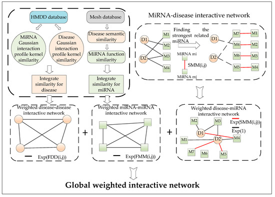 The identification of potential miRNA–disease associations can not only play an important role in the diagnosis, treatment, and prevention of disease, but also effectively addresses the high cost and long-term shortcomings of traditional biological experiments [13,14]. Up to now, various miRNA-related heterogeneous biological databases were established and were extended to various fields of miRNA-related research, such as miRBase [15], Database of Differentially Expressed miRNAs in Human Cancers (dbDEMC) [16], Human microRNA Disease Database (HMDD) [17], miR2Disease [18], etc. Based on these datasets, different computational prediction methods were developed to predict potential miRNA–disease associations [19,20,21,22,23,24]. For example, in 2012, Chen et al. developed a prediction method named random walk with restart for miRNA–disease association (RWRMDA) for inferring potential miRNA–disease associations through combining the semantic similarity of the disease and the functional similarity of miRNA [25]. In 2014, Chen et al. further developed a computational model named regularized least squares for miRNA–disease association (RLSMDA) based on semi-supervised machine learning, which can uncover related miRNAs for each disease without any known related miRNAs [26]. In 2016, under the basic assumption that functional similar miRNAs tend to interact with similar diseases, Chen et al. proposed a prediction model named within and between Score for miRNA–disease association (WBSMDA) by combining the within score and between score from the opinion of diseases and miRNAs to calculate the score and predict potential miRNA–disease associations [27]. Furthermore, Zou et al. also developed a machine learning based method named CATAPULT to uncover relationships between microRNAs and diseases based on social network analysis methods [28]. Zhu et al. developed a novel path-based method named PBMDA to predict the relationships between miRNA and disease by integrating different types of heterogeneous biological datasets and constructing three interlinked sub-graphs [29]. In 2017, Chen et al. proposed LRSSLMDA where novel miRNA–disease associations were predicted using sparse subspace learning to map high-dimensional miRNA/disease spaces into a lower-dimensional subspace [30]. In LRSSLMDA, feature extraction was performed on the integrated similarity to form the statistical profile and the graph theoretical profile. In 2018, Chen et al. developed a novel computational model named MDHGI to predict potential miRNA–disease associations using a sparse learning method to decompose the original adjacency matrix and combing the miRNA functional similarities network, the disease semantic similarities network, the Gaussian interaction profile kernel similarities network, and the new adjacency matrix into a heterogeneous graph [31]. Zhao and Wang presented a distance correlation set-based prediction method named DCSMDA for predicting latent miRNA–disease associations by constructing the disease/long non-coding RNA (lncRNA)/miRNA interactive network [32]. Moreover, Chen et al. developed an extreme gradient-boosting machine with a decision tree named EGBMMDA, seeking potential miRNA–disease associations using vector-covered statistical measures, graph theoretical measures, and matrix factorization results for miRNAs and diseases [33]. Chen et al. proposed a rating-integrated bipartite network recommendation-based prediction method named BNPMDA for predicting potential miRNA–disease association using agglomerative hierarchical clustering [34].