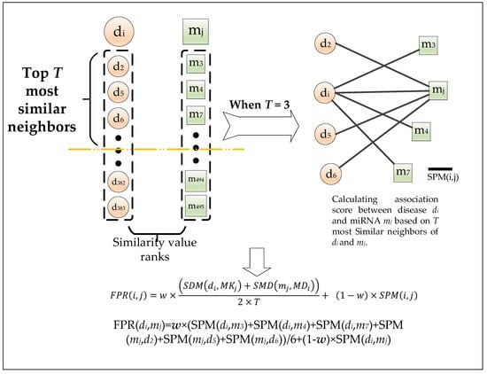 Considering the fact that known miRNA–disease associations are very sparse, for a specific disease di and a specific miRNA mj, as illustrated in Figure 5, in this section, we adopt the concept of T most similar neighbors to estimate the association between di and mj according to the following steps: