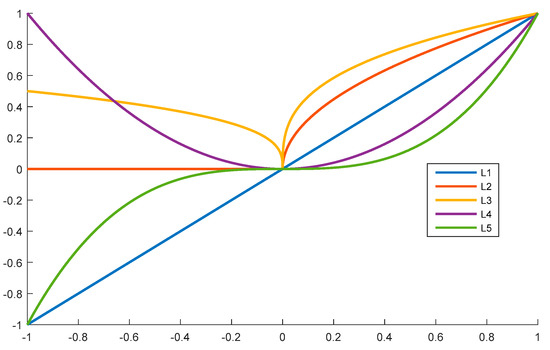 Curves of Equations (4)–(8) in the range [−1, 1].