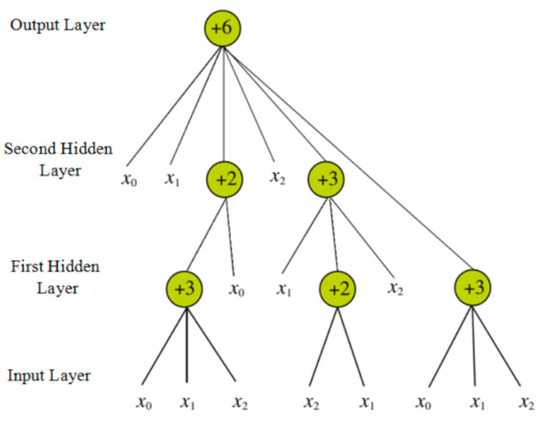The flexible neural tree (FNT) was proposed by Chen [63,64], and it can be treated as an alternative tree neural network. Therefore, this model can be utilized to deal with the issues of classification and prediction in the field of machine learning. The typical structure of an FNT is shown in Figure 7.