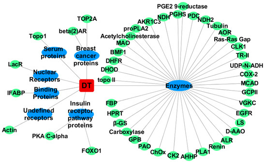 The breast cancer proteins (Table S34) with good docking affinities in silico toward TDT are Beta-2 adrenoceptor, MMP-16, MMP−9, DNA topoisomerase II and CHEK2, with binding scores of −9.5 kcal/mol, −9.1 kcal/mol, −8.8 kcal/mol, −8.5 kcal/mol and −8.2 kcal/mol, respectively.