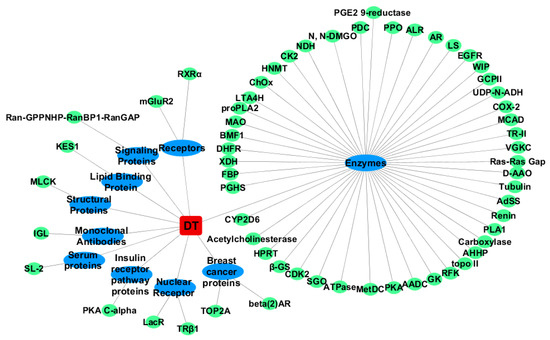 The results of validation for TDT are listed in Table S38. Similar to CDT, the deeply screened targets belong to the group of enzymes, insulin receptor pathway proteins and breast cancer proteins. In addition, nuclear receptor (TRβ1) is also connected to TDT binding. Furthermore, the target involved in enzymes with the best binding score is αT with a value of −11.2 kcal/mol, better than the co-crystallized ligand (−9.1 kcal/mol).