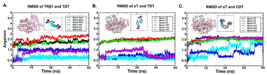 The RMSD of protein backbone atoms and heavy atoms of ligands along the production phase simulations. The RMSD of the protein backbone atoms and ligand atoms from TRβ1-TDT, αT-TDT and αT-CDT system are shown per panel (A), (B) and (C). Different replicates were displayed by the colour lines indicated in each legend box. The superposed proteins by tube were made by superposing 60 conformations (20 conformations per replicate) with 100 ps interval along the production phase. The degree of the dispersion of the tubes indicated the protein dynamics along simulation time series (‘red to blue′ represents ‘0 ns to 60 ns′). The ligands superposed with the same method were shown nearby and draw by sticks.