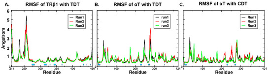 The residue flexibility of the proteins was further checked by RMSF (Figure 4). The high fluctuations were only found from the loops of TRβ1 (K211, average 2.78 Å, Q235 average 2.98 Å, Q252-A258, average 3.32 Å) and αT (G34-Q35, average 2.56 Å, L248, average 2.87 Å, A281, average 2.94 Å). The residues involved in the binding of ligands resulted in smaller average fluctuations (0.42 Å for TRβ1-TDT, 0.45 Å for αT-TDT, 0.49 Å for αT-CDT), suggesting the reasonable conformations were obtained from the docking procedure. However, we observed higher residue fluctuations in the ligand-contact residues of loopF270-Q279 (3.41 Å for αT-CDT, 2.82 Å for αT-TDT) in αT systems. Since the loop F270-Q279 was located at the rim of the pocket, it might account for the fluctuation of CDT because of the synergetic movements between the receptor and the ligand.