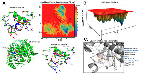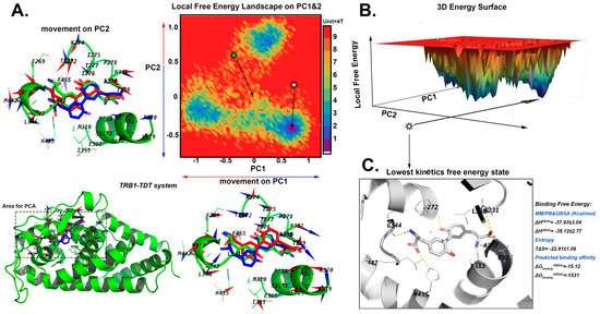 The search for the lowest free energy poses in αT-TDT MD system by local free energy landscape (LFEL) and MM/GB and PBSA calculations. (A) The 2D LFEL heat map. The green star shows the docked conformation with the coordinate (0, 0), and is viewed as a reference structure. The highest local free energy was defined as 10 kT, which can barely be sampled from all the conformational space. The bottom left shows the areas for which PCA calculations were carried out. The docked pose is in green. The movements on PC1 and 2 vectors from the production phase simulations are shown as a porcupine plot alongside with the axis. The scales of arrows are proportional to the scale of movements observed along each PC. The movements towards the positive direction of PC are in blue, and that of negative direction are in red. TDT are in sticks; blue and red sticks represent the minimum and maximum conformations observed by the PC vectors, and surrounding residues are shown as cartoon. The docked pose is coloured in green. (B) The converted 3D surface of FEL with the same colour code as shown in panel A. (C) The collected state with lowest kinetic free energy. The protein is in white cartoon, TDT are shown by sticks, and the nearby residues are shown as white lines. The hydrogen bonds are indicated by yellow dashes. The collected conformation and the nearby 50 frames were used for calculating the binding free energy, which are displayed nearby panel C.