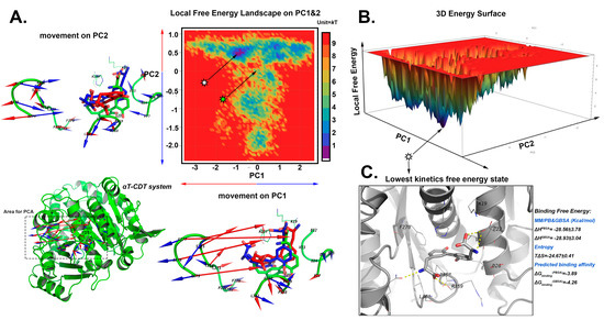 The search of lowest free energy poses in αT-CDT MD system by local free energy landscape (LFEL) and MM/GB and PBSA calculations. (A) The 2D LFEL heat map. The green star shows the docked conformation with the coordinate (0, 0), and is viewed as a reference structure. The highest local free energy was defined as 10 kT, which can barely be sampled from all the conformational space. The bottom left shows the areas for which PCA calculations carried out. The docked pose is in green. The movements on PC1 and 2 vectors from the production phase simulations are shown as a porcupine plot alongside with the axis. The scales of arrows are proportional to the scale of movements observed along each PC. The movements towards the positive direction of PC are in blue, and that of the negative direction are in red. CDT are in sticks; blue red sticks represent the minimum and maximum conformations observed by the PC vectors and surrounding residues are shown as cartoon. The docked pose is coloured in green. (B) The converted 3D surface of FEL with the same colour code as shown in panel A. (C) The collected state with lowest kinetic free energy. The protein is in white cartoon, CDT are shown by sticks, and the nearby residues are shown as white lines. The hydrogen bonds are indicated by yellow dashes. The collected conformation and the nearby 50 frames were used for calculating the binding free energy, which are displayed nearby panel C.