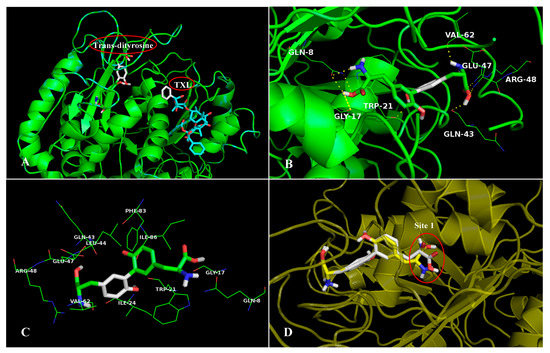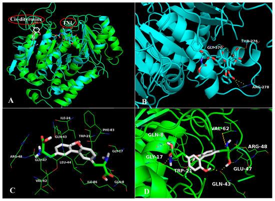 (A) Superposition between the crystallographic structures of the complex 1UTB/TXL with the resultant docking pose of 1UTB/CDT. Crystallographic structure and docking structure are represented in blue and green, respectively. (B) The enlargement for ligand TXL in the binding site of 1UTB, which is displayed as stick, hydrogen bonds are shown as dotted yellow lines, and the non-polar hydrogens were removed for clarity. (C) The active site amino acid residues around CDT. (D) The enlargement for ligand CDT in the binding site of 1UTB, which is displayed as stick, hydrogen bonds are shown as dotted yellow lines, and the non-polar hydrogens were removed for clarity.