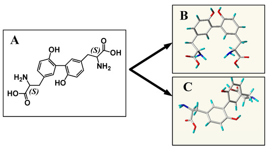 (A) Chemical structure of dityrosine. (B) Three-dimensional structure of CDT. (C) Three-dimensional structure of TDT.