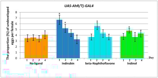 Daily effect of exogenous ligands on the proportion of undeveloped eggs from wild-type female after crossing with UAS-AhR/Tj-GAL4 male without exposure to ligands (control, orange), exposed to indirubin (blue), beta-Naphthoflavone (azure), indinol (green). Data correspond to the mean ± SD of three independent experiments. Asterisks mean the significant difference compared to the control group. Statistical analysis was performed using Student’s t-test (* p ≤ 0.05).