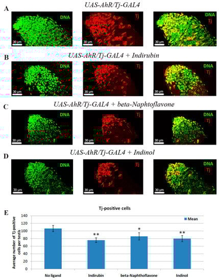 To test our hypothesis, we estimated the number of Tj-positive cells in testes of UAS-AhR/Tj-GAL4 flies fed with AHR exogenous ligands for two days, also using control UAS-AhR/Tj-GAL4 flies developed on a standard medium. We found that the testes of flies fed with xenobiotics were thinner (Figure 2), and a decrease in the average number of Tj-positive cells per testis was observed in flies fed with xenobiotics for 3 days (indirubin 75.8 ± 6.19; n = 18, beta-Naphthoflavone: 86 ± 9.7; n = 13, indinol: 79.8 ± 8.1; n = 14) when compared to testes from males raised on the standard medium (106.3 ± 8.25; n = 24) (Figure 2E). No remarkable differences between testis of Tj-GAL4/+ flies fed with xenobiotic and testis of flies with the same genotype developed on standard medium were detected (Appendix A Figure A1). Thinner testes were typical for only UAS-AhR/Tj-GAL4 flies fed with xenobiotic so we attributed this effect to the ectopic AHR activation.