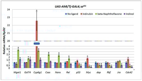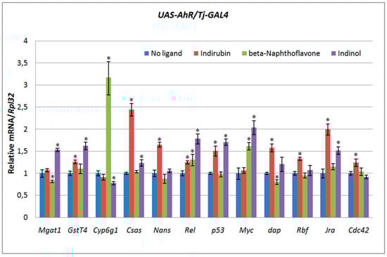 To investigate the effects of exogenous ligands in vivo, we analyzed the expression of AHR target genes by RT-PCR in testes of UAS-AhR/Tj-GAL4 flies fed with xenobiotics for two days. To activate human AHR, we used exogenous ligands known to act as agonists of this receptor. This means that these molecules only cause an increase in the transcription levels of AHR target genes [20,37]. We found that induced human AHR had pleiotropic effects on its target genes, depending on the nature of the exogenous ligand. In other words, the xenobiotic-mediated effect of human AHR activity in testes of UAS-AhR/Tj-GAL4 flies resulted in three different ways: Some experienced a decrease in the gene expression, some an increase in gene expression, and several genes had no response to AHR activity (Figure 3). For example, the activation of human AHR by indirubin resulted in the activation of almost all genes tested except Mgat1, Cyp6g1, and Myc. The activation of human AHR by beta-Naphthoflavone resulted in the activation of Cyp6g, Rel, and Myc, and the suppression of Mgat1 and dap genes. The activation of the human AHR by indinol resulted in the suppression of Cyp6g and the weak activation of Mgat1, GstT4, Csas, Rel, p53, Myc, and Jra genes.