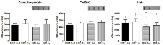 Effect of N-butyl-N-(4-hydroxybutyl) nitrosamine (BBN) exposure and/or exercise training on serum levels of C-reactive protein, TWEAK and irisin. Representative immunoblots are shown above the correspondent graph (sample order has correspondence to the order of the groups presented in the graph). Values are expressed as mean ± standard deviation of n = 6 (* p < 0.05 vs. CONT+Sed; + p < 0.05 vs. CONT+Ex).