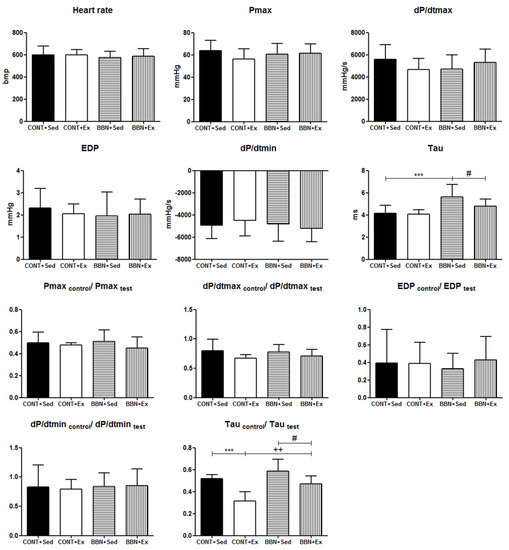 Effect of BBN exposure and/or exercise training on cardiac function in baseline and stress conditions: heart rate, left ventricular Pmax, dP/dtmax, EDP, dP/dtmin, Tau, Pmaxcontrol/Pmaxtest, dP/dtmaxcontrol/dP/dtmaxtest, EDPcontrol/EDPtest, dP/dtmincontrol/dP/dtmintest and Taucontrol/Tautest. Pmax, maximum pressure; dP/dtmax, peak rate of pressure rise; dP/dtmin, peak rate of pressure fall; EDP, end-diastolic pressure; Tau, time constant of ventricular pressure decay. Values are expressed as mean ± standard deviation of n = 15 for BBN groups and n = 7 for CONT groups (*** p < 0.001 vs. CONT+Sed; ++ p < 0.01 vs. CONT+Ex; # p < 0.05 vs. BBN+Sed).