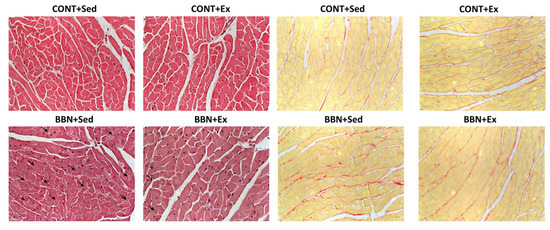 At the morphological level, mice from BBN+Sed group presented structural derangement of some cardiomyocytes, which was less evident in BBN+Ex. Regarding fibrosis, we also qualitatively detected more fibrosis in BBN+Sed animals, with exercise training preventing its increase in BBN+Sed (Figure 3).