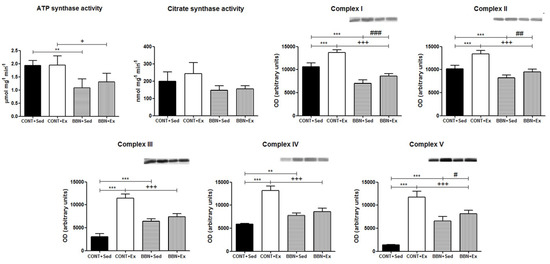 Effect of BBN exposure and/or exercise training on ATP synthase and citrate synthase activities, and on OXPHOS complexes subunits (complex I, CI-NDUFB8; complex II, CII-SDHB; complex III, CIII-UQCRC2; complex IV, CIV-MTCO1 and complex V, CV-ATP5A). Representative Western blots are shown above the correspondent graph (sample order has correspondence to the order of the groups presented in the graph). Values are expressed as mean ± standard deviation of n = 6 for BBN groups and n = 4 for CONT groups (** p < 0.01 vs. CONT+Sed; *** p < 0.001 vs. CONT+Sed; + p < 0.05 vs. CONT+Ex; +++ p < 0.001 vs. CONT+Ex; # p < 0.05 vs. BBN+Sed; ## p < 0.01 vs. BBN+Sed; ### p < 0.001 vs. BBN+Sed).